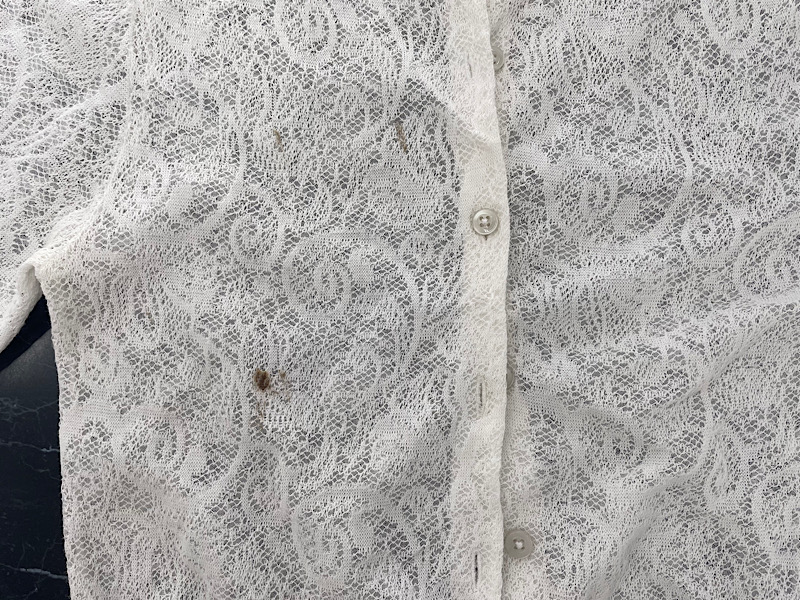 本日のご依頼は、お気に入りのカーディガンにうっかり毛染めの液をこぼしてしまい、シミ抜きで検索した結果、洗い人のホームページをご覧になって、当店にご来店いただきました。