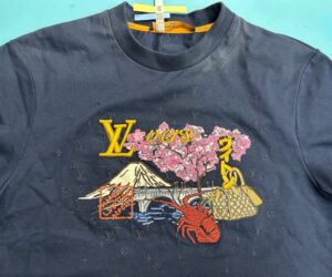 お気に入りのルイヴィトンの紺色刺繍飾りTシャツのエリにシミを発見!どうにか綺麗にしてとの御依頼です。