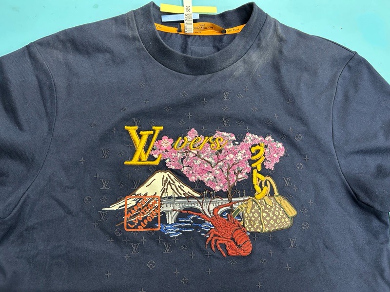 お気に入りのルイヴィトンの紺色刺繍飾りTシャツのエリにシミを発見!どうにか綺麗にしてとの御依頼です。
