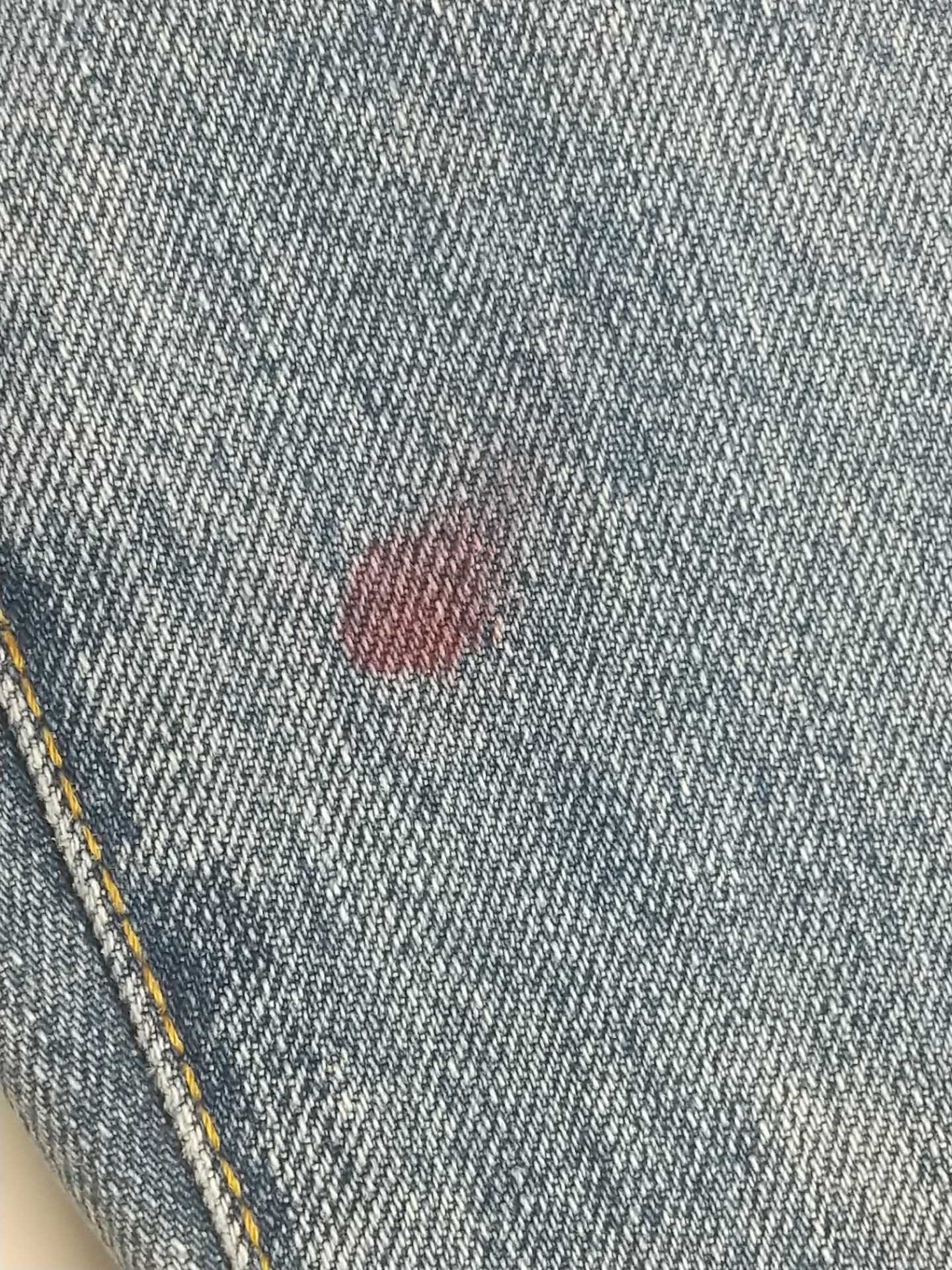 本日の事例はお気に入りのジーンズに水性のペンキを付けてしまって一部分に洗剤を付けて洗ってみたものの落ちなくて、お店に持って来て頂きました。