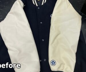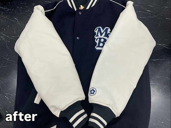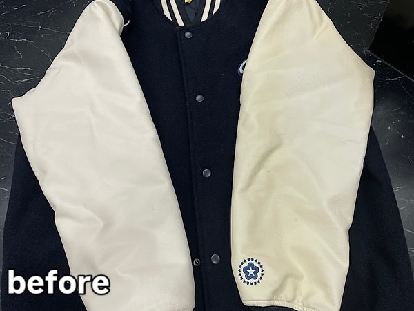 本日のご依頼は、お気に入りのスタジアムジャンバーを着ようと思ったら、左側が黄ばんでいるので、きれいにしていただけますか?とのご相談をいただきました。