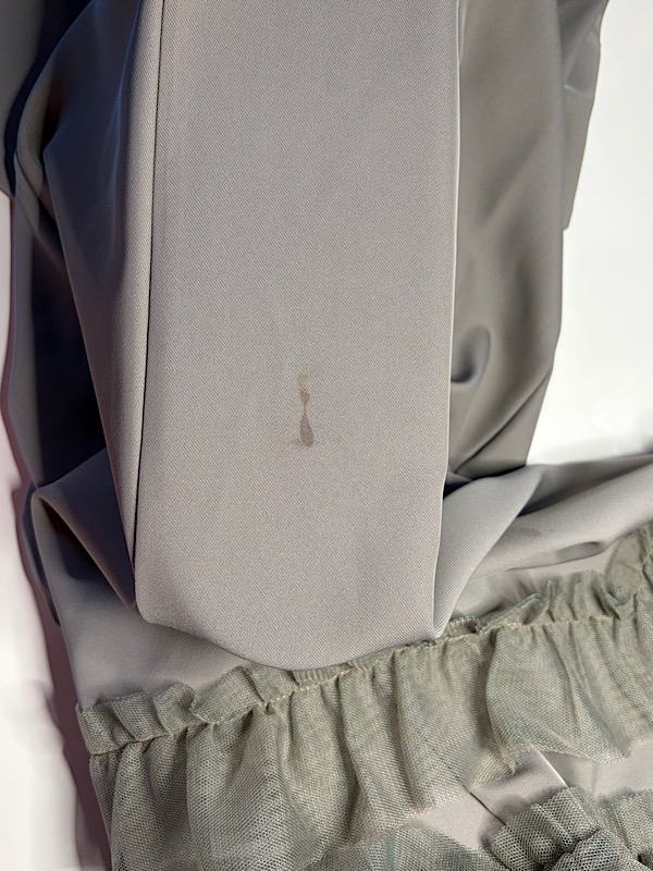 本日の事例は下前見頃にフランス料理の食べこぼしのシミが付いて目立つので取れますかとのご相談です。