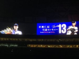 試合後の引退セレモニーでは、岩瀬、荒木の現役時代の名シーンをスクリーンで見て、あのドラゴンズの黄金時代を懐かしみながら、ちょっと涙腺が緩んできて、岩瀬、荒木のスピーチで完璧に涙腺が崩壊しました(涙)