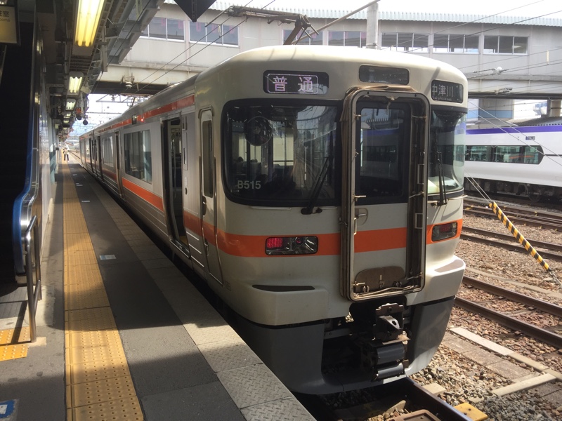 この電車はJR東海の313系のクロスシート車(進行方向に向かって2人がけのシートが並ぶタイプ)で普通電車の割りに快適に乗れますが、たった2両編成、しかも青春18きっぷ期間の混雑の中、ギリギリ2席確保できて中津川まで爆睡で乗れました。
