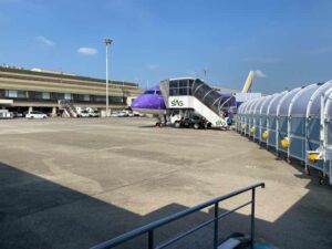搭乗時間になると通路を歩いていき、搭乗口でチケットを見せて、延び縮むするテントのような通路を進むと階段の車両がある感じで乗り込みます。