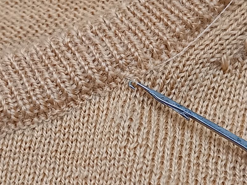恐らく縫製時に目が一つだけ落ちてしまっていたようです。着用の伸縮でいくつか目が落ちてしまったと思われます。こんな時は、より目立たないように、落ちた目を一つずつ拾ってから丁寧にお直しします。