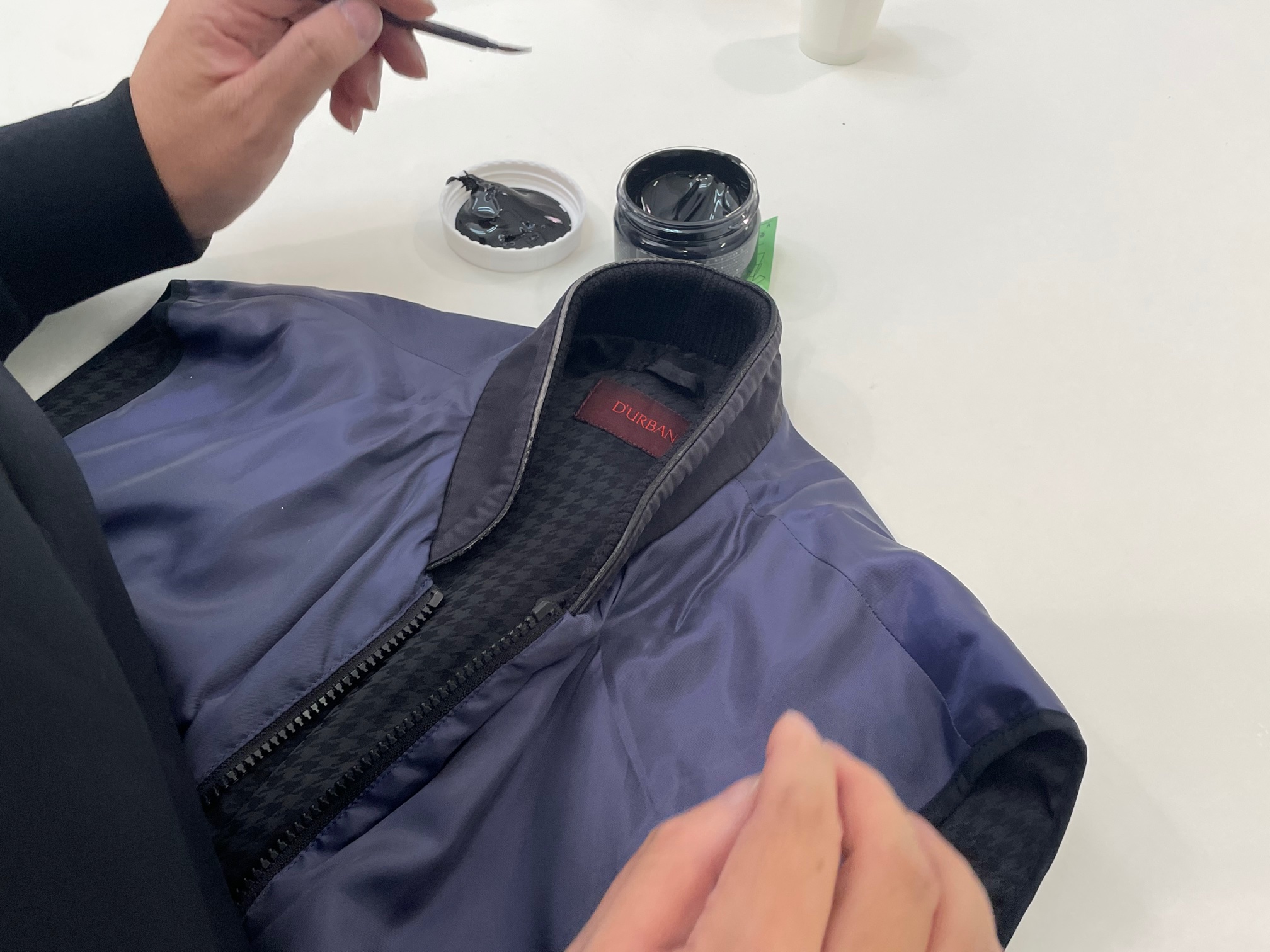 今回は、コートの生地が綿100%ではなくポリエステルが40%配合されていましたので作業に工夫が必要でした。