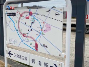 玉津浦駅跡の手前には、線路を模したラインが分岐しているところがあります。