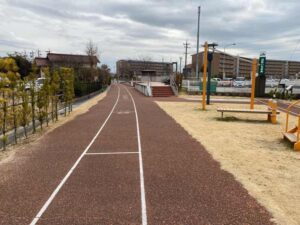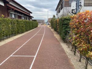遊歩道になっていますが、家と家に挟まれた空間を見ていると、線路があった感覚をしっかりと感じれると思います。