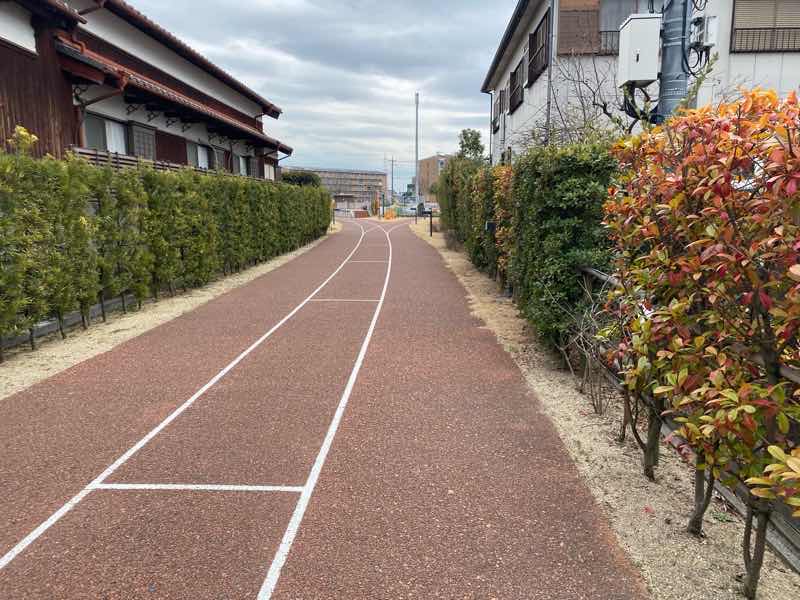 舗装された道には、レール風に線路が描かれていました。