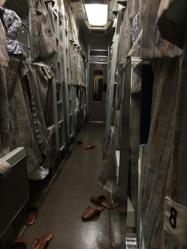 電車は6両編成で定員は240名ですが、このツアーの募集人員は150名で、ゆったり利用する事ができます。今回私たちは、3人で予約しましたが、3段寝台の向かい合わせ6人分を自由に使っていいという事で、中段寝台を荷物置き場にして、店主の私は幅の広い(106cm)下段を使いました。