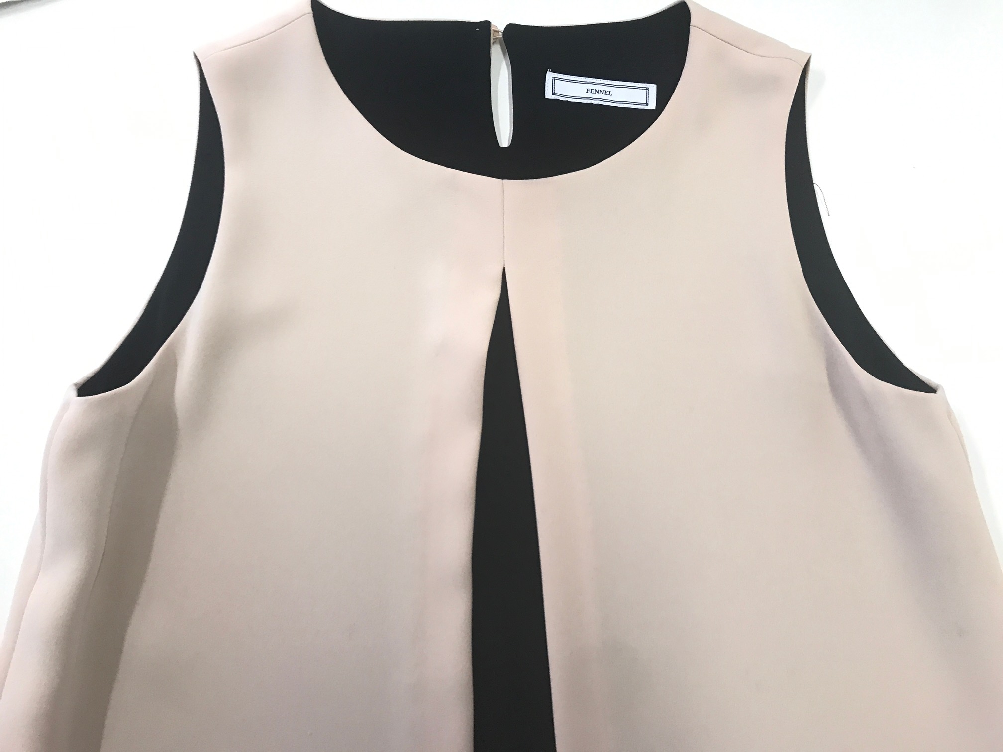このように紺のファ-ボレロの上着の色が汗が原因で色移りしてしまいましたが、特殊な移染処理を行いノ-スリ-ブワンピ-スの脇のシミをキレイに落とすることができました。