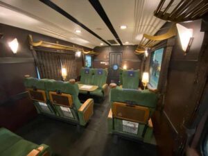 この車両は、近鉄の普通電車に使われるような古い車両を改造したもので、四つある扉を一つにして、1+2の座席配置でゆったりと座席が並んでいます。