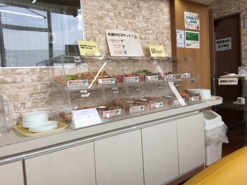 受付で料金の400円を払って着席して まずフリードリンクでコーヒーを頂き、それからココの目玉の しるこサンドが食べ放題の「ビスケットバイキング」へ! そこには松永製菓のいろんな種類のビスケットがたくさん並んでいます。さすがにビスケットばかりそんなに食べれませんが、子供を連れて行くときっと喜びますよ。