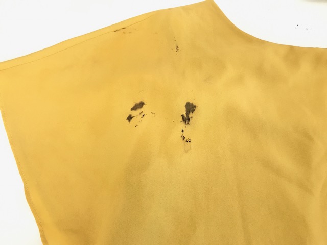 今回は、素材がポリエステル90%、レ-ヨン10%の鮮やかな黄色の色柄のお洋服でしたが、生地の地色を傷めることなくカラ-リング剤のシミをキレイに除去することができました。