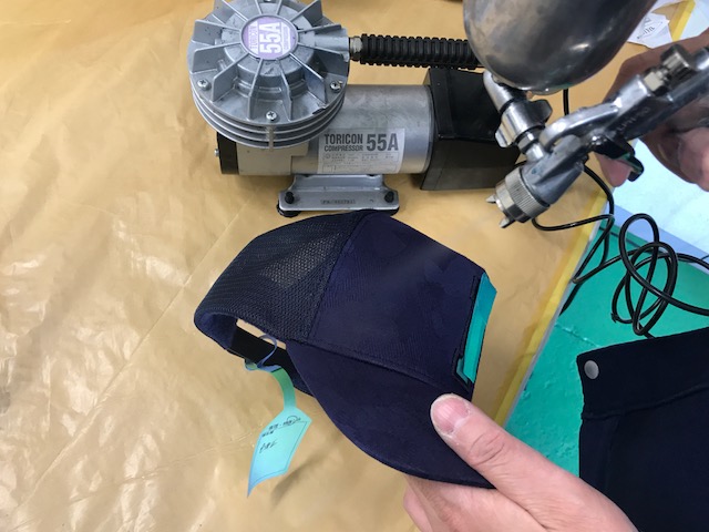 キャップの色を調合し、ロゴマークの部分をマスキングして、何度も何度もキャップの風合いや色合い・柄模様を確認しながら丁寧に色を吹きかけていきます。