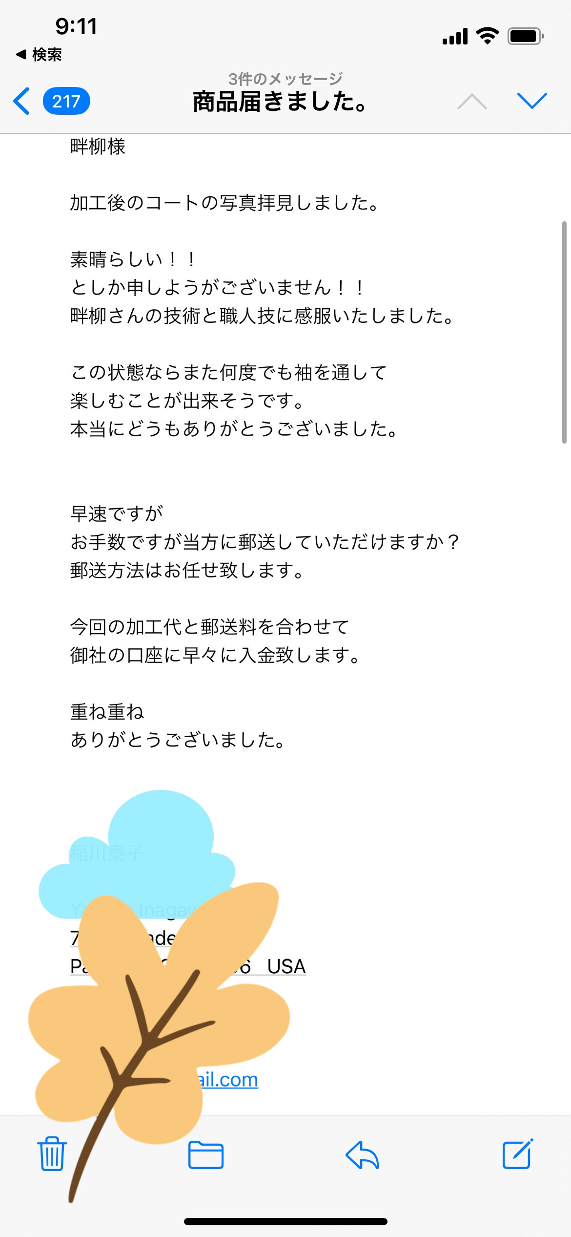 現地のクリ-ニング店では何も対処してもらえず、とても残念な想いをして当店を探してご連絡を下さい国際郵便で年明けに送られて来ました。