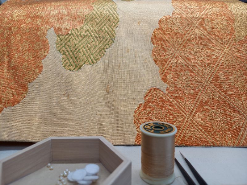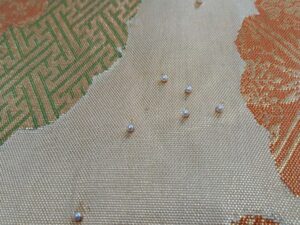 金糸の色に馴染みやすい生成色の極小(お米粒より小さい)パールビーズを、帯生地をできるだけ痛めないよう裏側にフェルトで補強しながら、